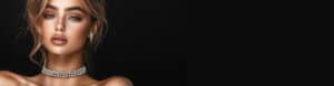 Close-up of a woman modeling stunning diamond jewelry, including a choker and earrings, emphasizing fine craftsmanship and elegance offered by david stern jewelers, perfect for special occasions and jewelry shopping.